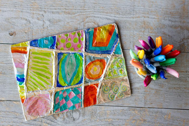 Ateliê, complementar à Hora do Conto, de expressão plástica de pintura em papel de alumínio.