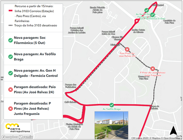 Todas as circulações da linha 3103 passarão a ter como paragem inicial/terminal a paragem AV GEN H DELGADO - FARMÁC CENTRAL. Adicionalmente, a circulação pela Rua José Relvas deixa de ser efetuada, pelo que deixam de ser servidas as paragens PAIO PIRES (AV JOSÉ RELVAS 24) e PAIO PIRES (AV JOSÉ RELVAS) JUNTA FREGUESIA. É criada uma nova paragem na AV. TEÓFILO BRAGA. As restantes paragens são mantidas.