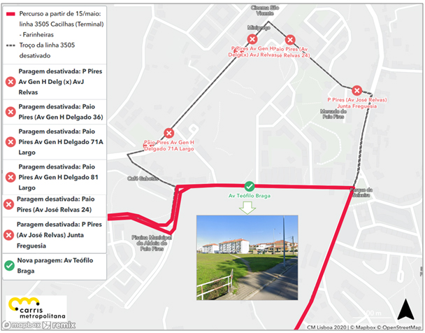 Todas as circulações da linha 3505 passarão a circular pela Av. Teófilo Braga, em alternativa à Rua José Relvas. Assim, deixam de ser servidas as paragens PAIO PIRES (AV JOSÉ RELVAS 24), PAIO PIRES (AV JOSÉ RELVAS) JUNTA FREGUESIA, PAIO PIRES AV GEN H DELGADO 71A LARGO, P PIRES AV GEN H DELG (X) AV J RELVAS, P PIRES (AV GEN H DELGADO 36) e PAIO PIRES AV GEN H DELGADO 81 LARGO. É criada uma nova paragem na AV. TEÓFILO BRAGA. As restantes paragens são mantidas.