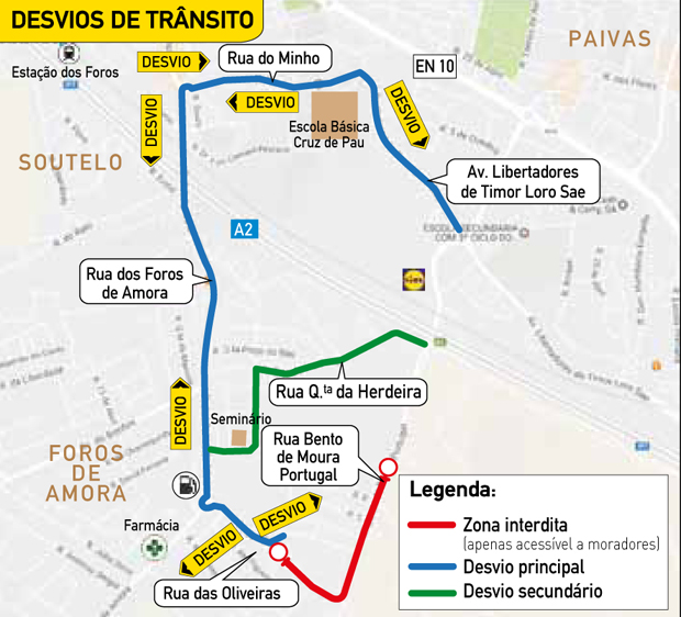 O trânsito estará parcialmente interdito num troço da Rua das Oliveiras e na Rua Bento de Moura Portugal, estando acessível apenas a moradores.