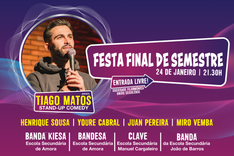 A Festa Final de Semestre assinala a próxima pausa letiva e este ano é celebrada a rir com o espetáculo de stand-up comedy trazido pelo anfitrião Tiago Matos, num espetáculo a decorrer na Sociedade Filarmónica União Seixalense, no dia 24 de janeiro, o qual contará com os seus convidados e ainda as bandas das escolas do concelho. A entrada é livre!